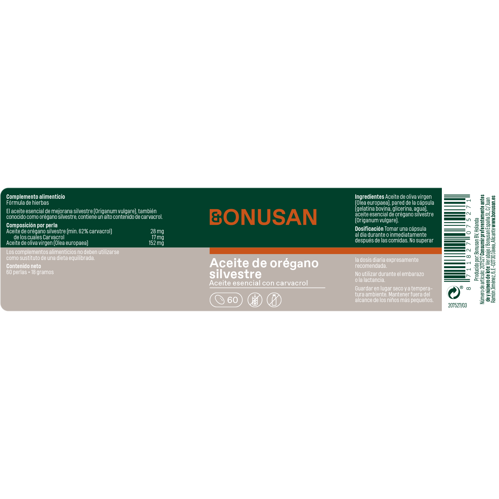 Aceite de oliva virgen (Olea europaea), pared de la cápsula (gelatina bovina, glicerina, agua), aceite esencial de orégano silvestre (Origanum vulgare).