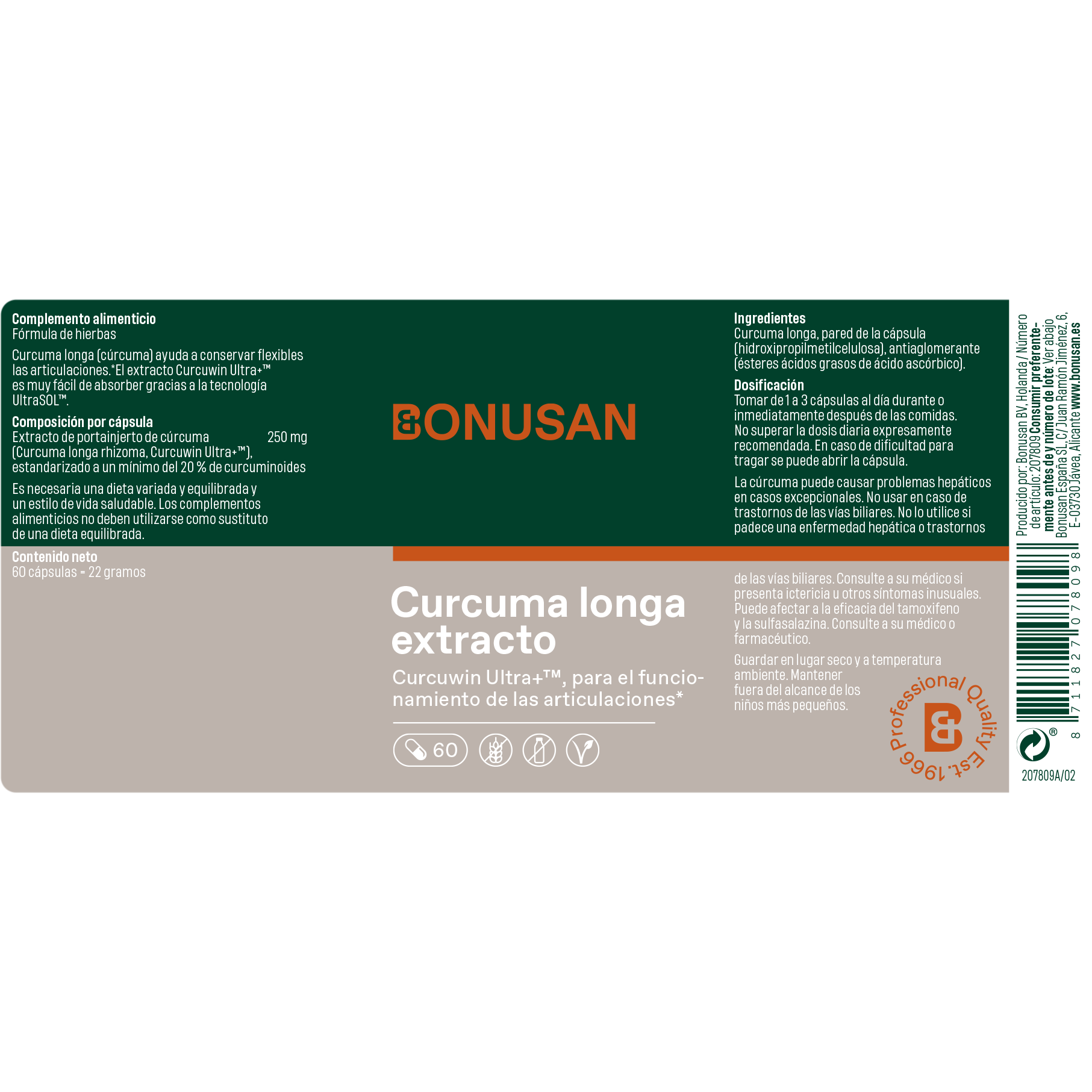 El extracto de Curcuma longa de Bonusan es un suplemento de cúrcuma fácilmente absorbible, estandarizado en curcuminoides, su principio activo. Este suplemento: