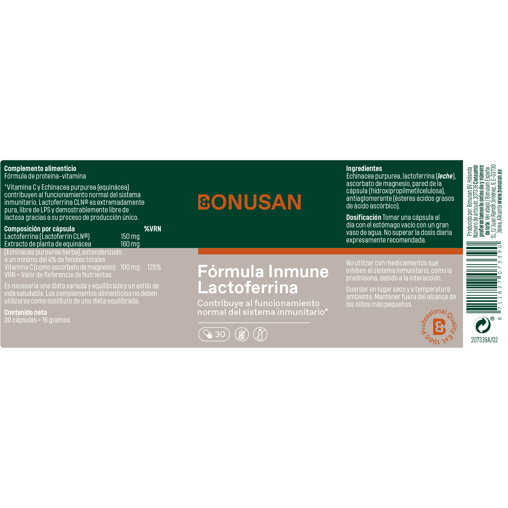 Echinacea purpurea, lactoferrina (leche), ascorbato de magnesio, pared de la cápsula (hidroxipropilmetilcelulosa), antiaglomerante (ésteres ácidos grasos de ácido ascórbico).