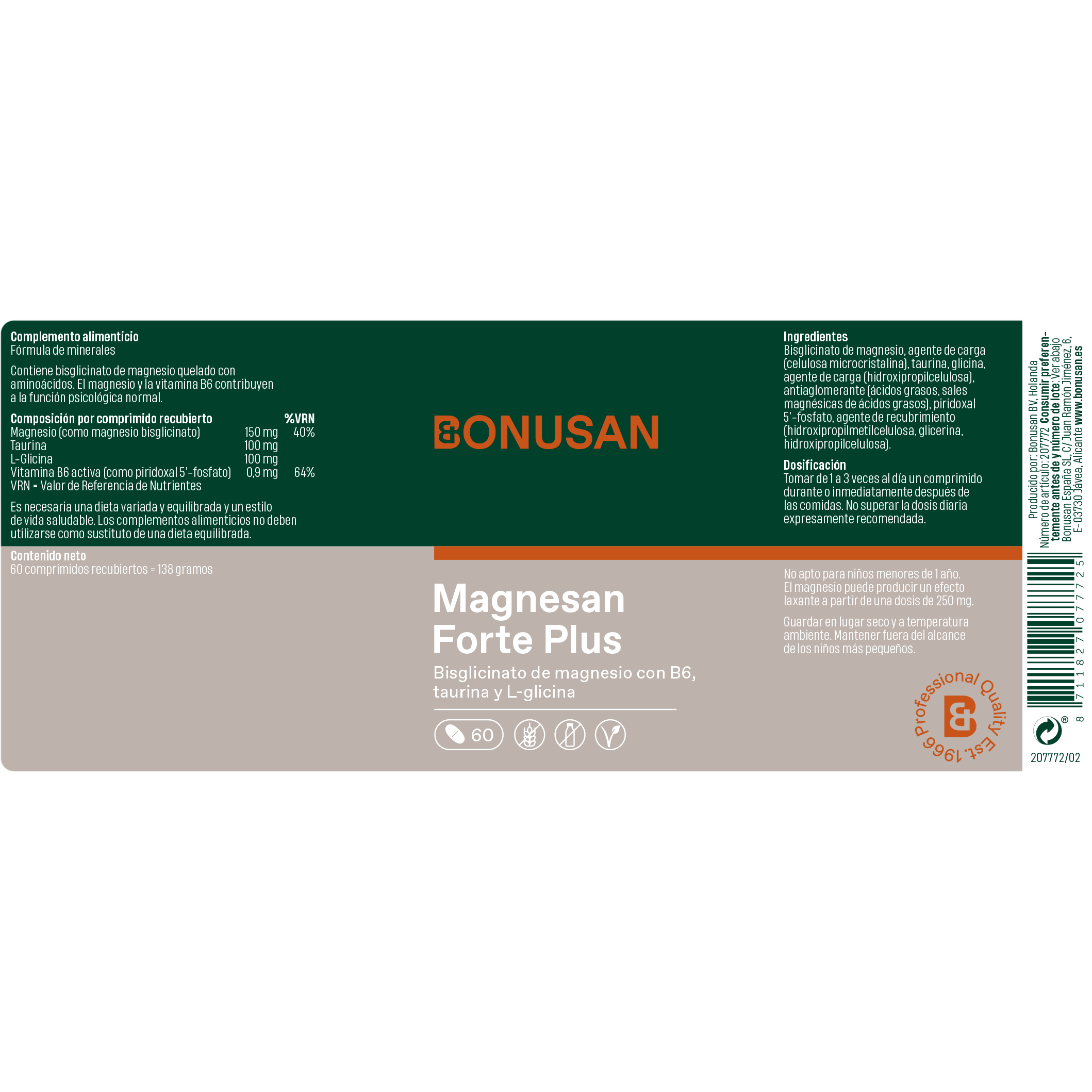 - Magnesio en forma de bisglicinato de magnesio de fácil absorción, totalmente libre de óxido de magnesio